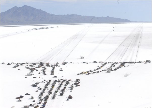 Here's a photo taken from some type of aeroplane-thingy at SpeedWeek '07, I think. To give some idea of the scale -- the pits are visible in the upper left corner of the photos -- and are about 2 1/2 - 3 miles away from the start lines, which are in the center/bottom of the page. There are two courses -- a "long" course, which is five measured miles plus some shut down, and a "short" course, which is three measured miles plus shutdown. Between the courses, and quite a ways down -- you can vaguely see the timing tower -- a larger structure than the small cars/trucks that are stationed between courses as "course watchers". The tower is about three miles from the start line. Way, way back -- just visible as a darker strip, before the base of the mountains -- is water, followed by some dry salt, then the foothills. Note that there's enough traction for vehicles to leave black strips where they've spun their tires. |
