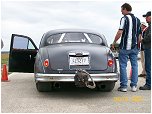 Okay. Many of the cars at the Hot Rod event are street-legal, many of 'em are even driven to the event. So -- imagine yourself at the stoplight near home and you look in front of you and see a Jaguar. Nice older model, but there's something different about it. Is it the parachute that's on the back? Or the tires that are really WIDE! How about the big dual exhaust pipes? Yup, this is a Jag -- but not the kind your Uncle from England drove, no doubt. |