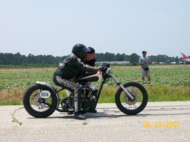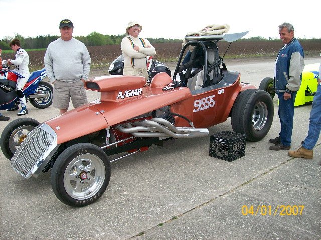 Here are some photos that Nancy and I took during the '07 season at Maxton, NC. These photos were taken in April, at the event that's promoted as the Hot Rod Magazine Top Speed Challenge. Here's a link to the web page. Maxton is the town where the East Coast Timing Association holds meets about five times a year -- on a closed airstrip at a small airport (you'll see old airplanes in the background of some of the photos). The strip was built in WWII days as a glider pilot training strip -- that's why there's a turn about a hundred yards after the start line. That is, the glider would be attached to the tow plane by a cable, and the glider would be offset to the side so when the plane started moving -- the geometry of the angle would allow the plane to gain a bit of speed before the full weight of the glider tried to slow the plane. Here's a little bit from the ECTA website, including an aerial view (scroll down when you get there). Okay -- Maxton is the land speed racer's only place to run east of the Mississippi River. It's a paved track, so there are big differences between there and Bonneville (traction and potholes!). And many of the racers at Maxton don't go to the Salt because of the - well, the salt -- that ends up all over, under, around, and through the race vehicles. Here are some photos of Maxton vehicles and racers: |