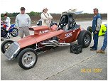 Whoa! Look at the size of that blower! And also notice the exhaust outlets in front of the front tires. This isn't as unusual as you might expect. The route the exhaust headers have to follow to get from engine to outside is always crooked and twisty -- and there's no reason not to have them dump to the atmosphere in front of the tires instead of behind. This is racing -- we don't have to worry about exhaust getting into the eyes of folks riding in the back seat as we mosey down the lane on the way to the local convenience store, so point the headers wherever it is convenient. |