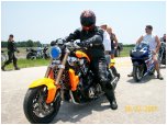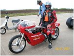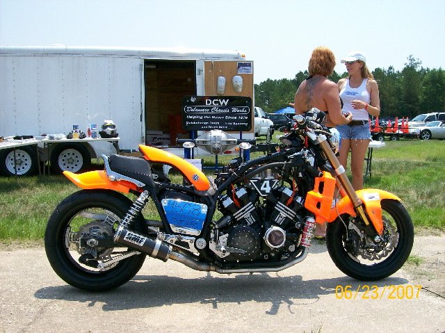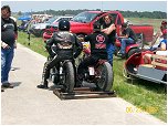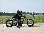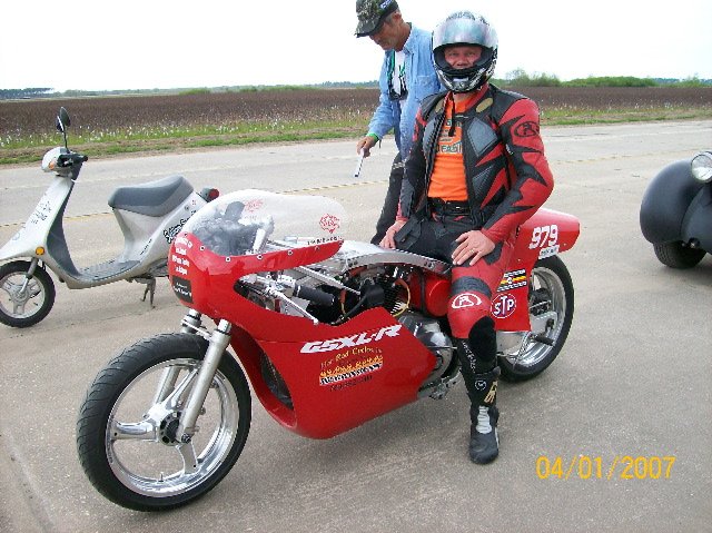 Here's Mark Wozniak astride an unusual bike built to fit into a specific class. It's powered by a Harley-Davidson type motor, but in a Suzuki-style chassis. Oh, yeah, and notice our pit bike right next to Mark's ride. This photo was taken in the motorcycle inspection area. I'm a tech inspector for bikes at Maxton and Bonneville, so I get to see many bikes up really close. |