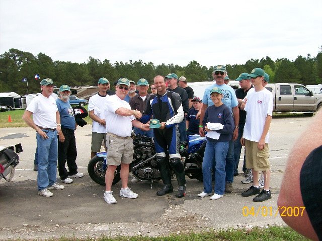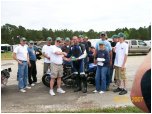 Bill gets his 200 MPH Club hat. I think I've explained it elsewhere, but in case you didn't see it there -- to gain membership in a 200 MPH Club requires setting a record over 200 mph, or breaking an existing record over 200, or setting a record that exceeds a pre-determined minimum speed over 200. It's not just going 200 mph. At the end of each event the members of the 2 Club hold an induction ceremony where the new member(s) is given his hat (here being given by Scott Guthrie, a racer Nancy and I know well, who has more than 200 official timing slips for runs over 200 MPH!), and where the present members welcome him to the group. I'm in the ECTA and the Bonneville 2 Clubs -- and someday hope to get into the Club at El Mirage dry lake, an old-time race venue northwest of Los Angeles. |