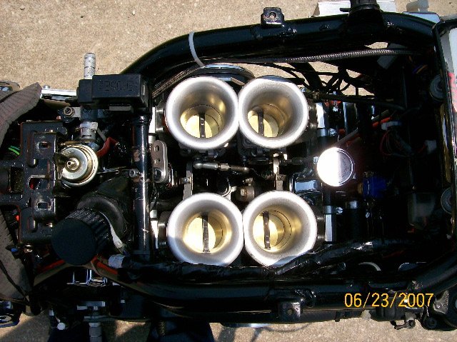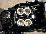 The V-Max, the air intake cover resting about where the rider sits. This bike is running in what's called the "naked bike" class -- that is, no streamlining is allowed in front of the rider -- no windshield, no fairing, nothing that would give the bike an aerodynamic advantage. The air "scoop" that's around the radiator doesn't give advantage -- in fact it makes things worse -- so it's allowed. Notice Nancy in the background, chatting with one of the other racers. The ECTA is a pretty small group of dedicated racers, and we all pretty much know everyone else in the group. It's very close-knit. Okay, back to the V-Max. Take a look at the Bonneville page here and you'll find a photo of me and a V-Max that I rode out there. Different bike, same idea -- naked, lots of power, fun ride! I went about 184 on my first and only pass down the course. |