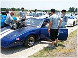 This A/GMR - engine size class "A", burns gasoline (not nitromethane or nitrous oxide or alcohol), modified roadster (not strictly duplicating a production roadster but with many similarities) is a good example of a specially-built car. Let's see -- big block motor, most likely Chevy. That tube that hooks into the headers is a vent from the crankcase so oil and other stuff that builds up down in there can be released into the atmosphere, but is mixed with the hot exhaust so it vaporizes instead of spraying oil on the track. Note the wing on the top of the roll cage -- the wing doesn't add too much drag, but does give some down force as speeds get higher, and that means more traction to reduce wheelspin at high speed. |