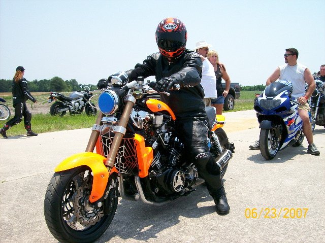 This is a Yamaha V-Max bike. See the blue headlight? Headlights and other glass are required to be taped -- so, in case of a crash, the track workers can pick up one piece of tape with lots of pieces of glass or plastic attached, instead of having to pick up zillions of pieces of shattered glass. |