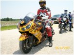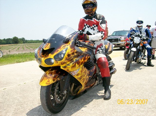 Here's a Kawasaki ZX14R -- with a custom paint job. I'd hazard a guess that the rider didn't spend much time trying to coordinate the paint job with the colors on his leathers. Just behind the rider's leg you can see a pair of horizontally-mounted pressure bottles, most likely holding nitrous oxide -- which is used as an oxidizer. In other words, the nitrous supplies a bunch of extra oxygen, and the engine computer tells the fuel injectors to squirt in a bunch of extra fuel -- and the result is more horsepower. Or, if things aren't calibrated correctly, the result is a blown up engine. Don't ask me how I know! |