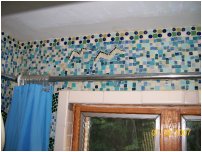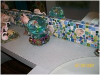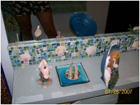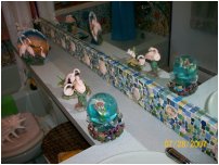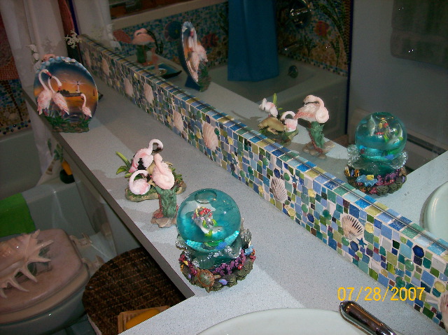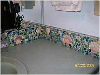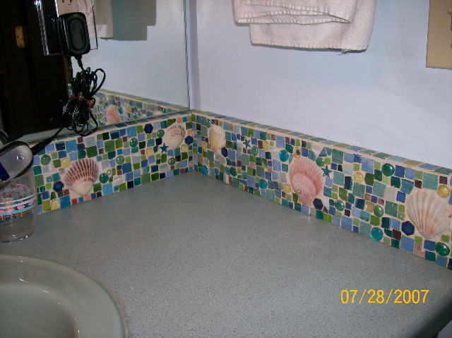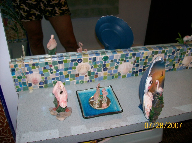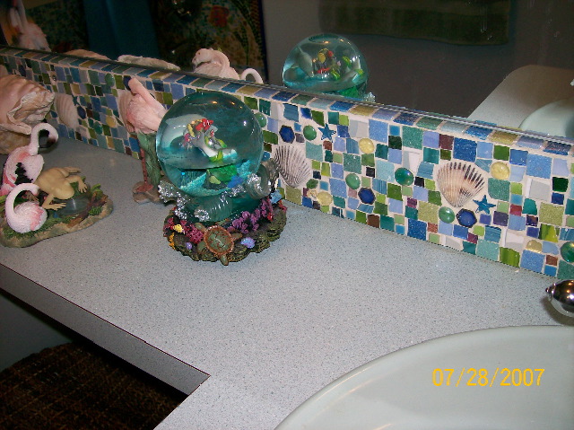 | A longer shot of the backsplash, showing not only how the top edge of the 'splash reflects in the mirror, but also some of the tropical-motif knick-knacks -- and, if you look closely in the upper left corner of the photo, you can see our glow-in-the-dark froggie that helps us find our way in the dark. I knew you'd be interested in that tidbit of information. | |