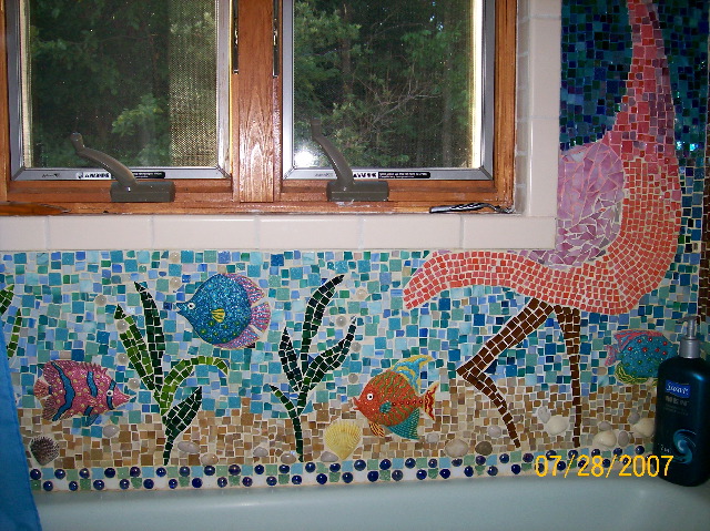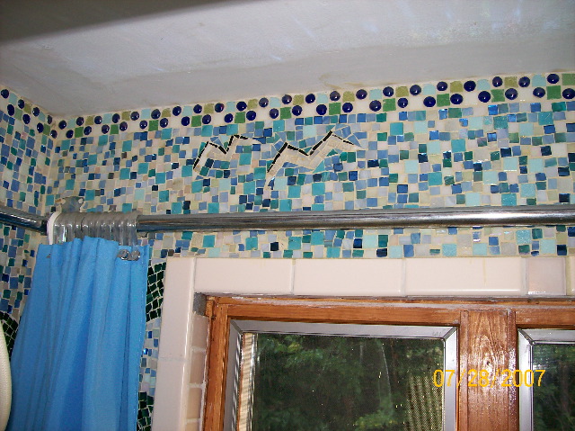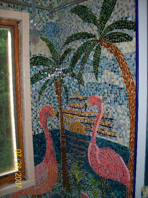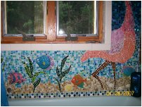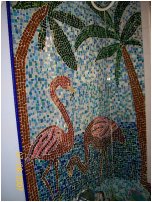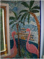 Here's a photo of the business end of our shower/tub surround (this end has the controls). Nancy did this without much in the way of guidance, too. When we moved into the house the bathroom needed to be completely rebuilt, so we had the workmen leave the sheetrock around the tub completely bare except for an extra waterproofing layer. Then she free-hand drew the art -- the trees, birds, where she'd put the fish, even the seagulls. A note to herself here and there about colors she would use -- and then she started gluing. Some of the pieces of glass are store-bought squares, and some (many!) are pieces she'd break into the shape she needed for a particular spot. Notice that she went to the trouble of using various greens (for instance) to make the palm tree leaves look more realistic, and ditto the browns and pinks in the birds. |